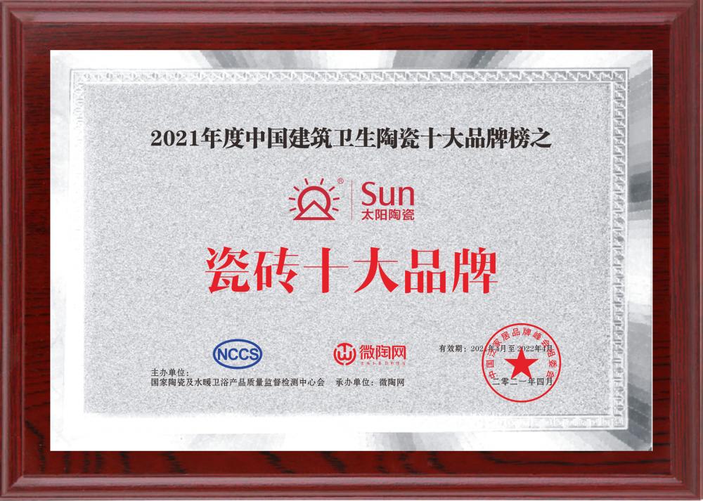 太陽陶瓷獲中國建筑衛生陶瓷“瓷磚十大品牌”殊榮
