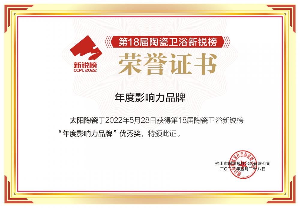 太陽陶瓷連續三年蟬聯陶瓷衛浴新銳榜/陶瓷品牌大會“年度影響力品牌”