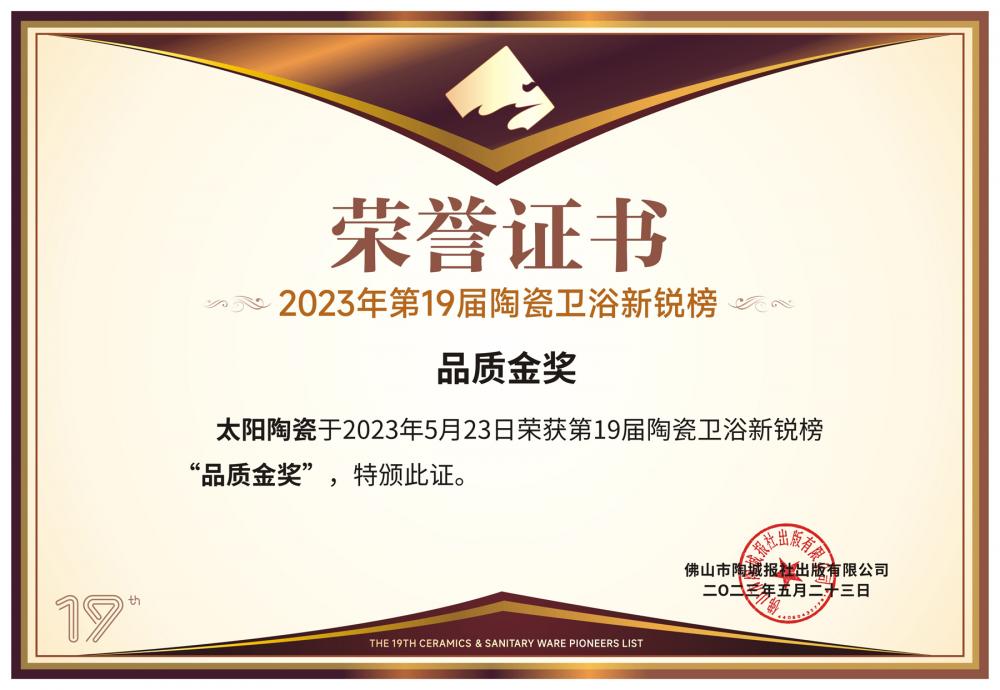 太陽陶瓷獲陶瓷衛浴新銳榜“品質金獎”